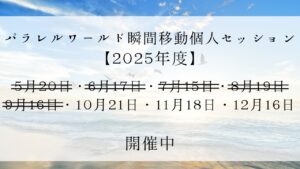一瞬で信念が書き変わる!パラレルワールド瞬間移動個人セッション 2025年度予約受付中 2024.10.22 2025年に元氣屋イッテル主催のセッションが開催されます。今回は『パラレルワールド瞬間移動個人セッション』です。詳細につきましては、以下のリンクをご覧ください。皆さまのご参加をお待ちしております。よろしくお願いいたします。◎詳細はこちら