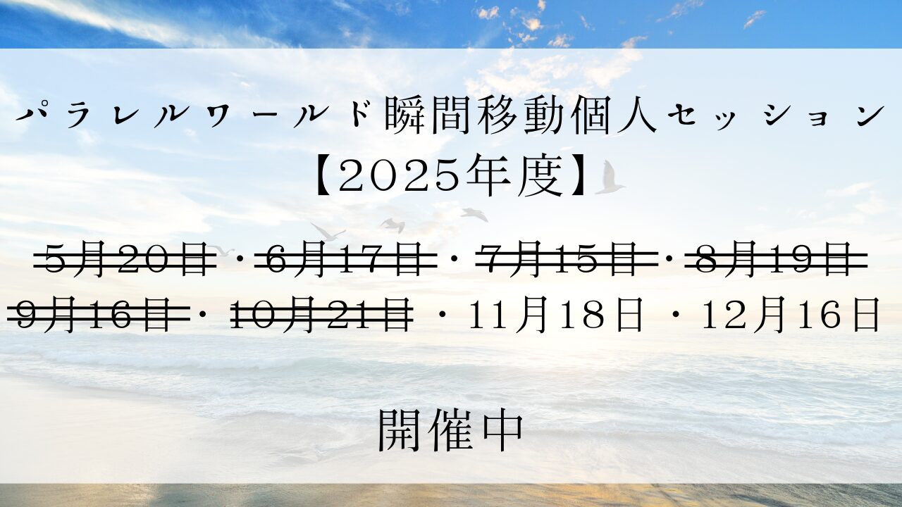 一瞬で信念が書き変わる!パラレルワールド瞬間移動個人セッション 2025年度予約受付中 2024.10.22 2025年に元氣屋イッテル主催のセッションが開催されます。今回は『パラレルワールド瞬間移動個人セッション』です。詳細につきましては、以下のリンクをご覧ください。皆さまのご参加をお待ちしております。よろしくお願いいたします。◎詳細はこちら
